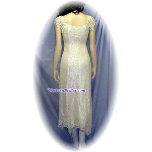 This pretty and flattering dress features Venice lace detail around open neckline and a 4 point Hanky Hem skirt